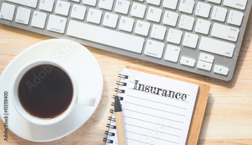 Concept Insurance message on book. A pencil and a glass coffee table.Vintage tone.