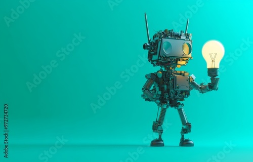 Concept of a futuristic robot with a warm and friendly cyborg character with big eyes and a light bulb in his hand. Copy space, blue background.
