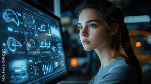 Concept of AI marketing and insurance tool, Woman looking at computer dashboard with visualization innovation for a car, travel, family, life, financial, and health insurance.