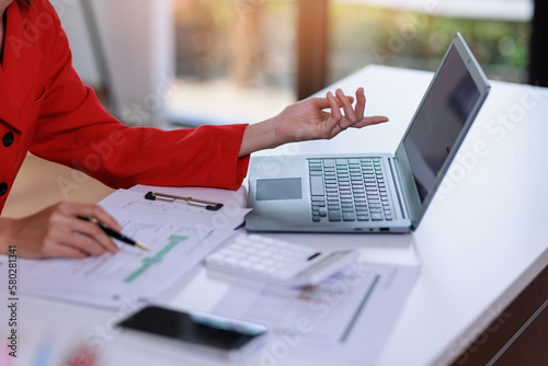 Concept of business invesment or woman working,Closeup businesswoman checking her invesment plan with analyzing document and business investment graph data by using calculator and computer laptop