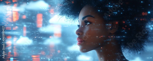 Concept of cloud computing with a 3D African American woman named Coco, including cloud service servers, data processing, blogging, website, and mobile app visuals