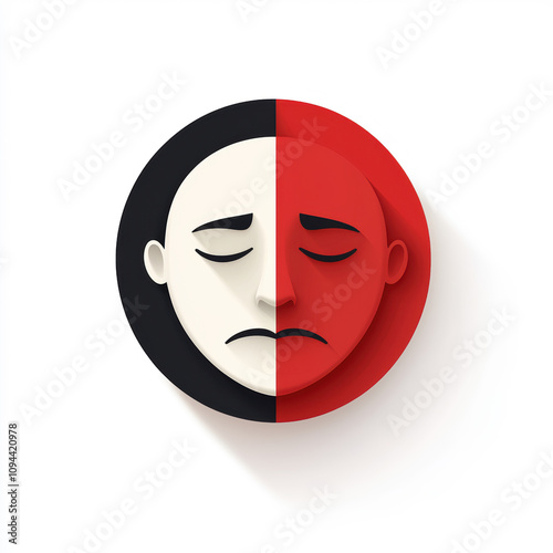 Concept of depression sadness diagnosis. A stylized face split in two; one side is black, the other red, conveying a sense of sadness or duality.