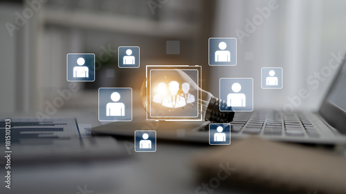 Concept of human resources and organizational structure. A professional team is shown within a corporate network, representing management, leadership, and collaboration. Fermion