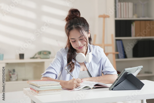 Concept of Online education. woman use Online education training and e-learning webinar on internet for personal development and professional qualifications. Digital courses to develop new skills.