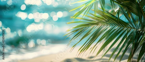 concept of relaxation on the ocean shore, white sand and palm leaves.
