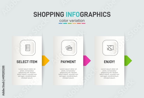 Concept of shopping process with 3 successive steps. Three colorful graphic elements. Timeline design for brochure, presentation, web site. Infographic design layout.