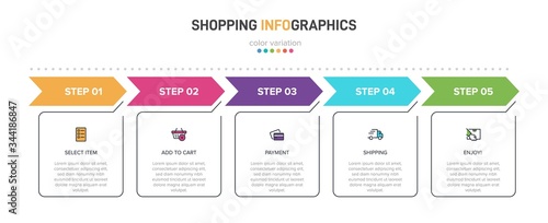 Concept of shopping process with 5 successive steps. Five colorful graphic elements. Timeline design for brochure, presentation, web site. Infographic design layout.