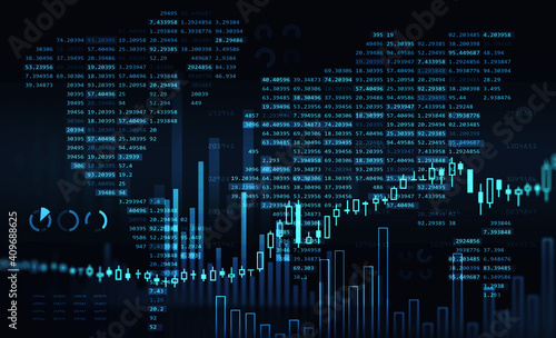 Concept of stock market and fintech forex concept. Blurry blue digital charts over dark blue background. Futuristic financial interface. 3d render illustration. World map