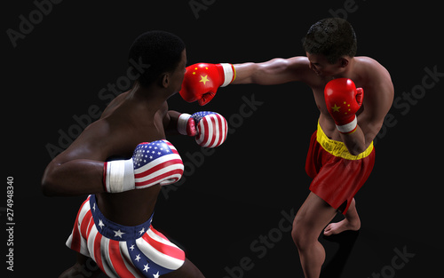 Concept of trade war between USA and China. 3d illustration two boxer fighting US and China flag trading punches for the concept: Trade War.