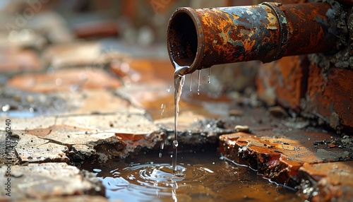 Concept of urban decay and failing infrastructure with water dripping from a rusty, corroded industrial pipe