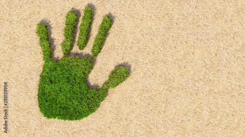 Concept or conceptual green grass handprint on hay background. A metaphor for ecology, environment, recycle, nature conservation, spring summer or protection against global warming 3d illustration