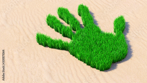 Concept or conceptual green grass handprint on sand background. A metaphor for ecology, environment, recycle, nature conservation, spring summer or protection against global warming 3d illustration