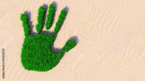 Concept or conceptual green grass handprint on sand background. A metaphor for ecology, environment, recycle, nature conservation, spring summer or protection against global warming 3d illustration