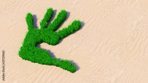 Concept or conceptual green grass handprint on sand background. A metaphor for ecology, environment, recycle, nature conservation, spring summer or protection against global warming 3d illustration