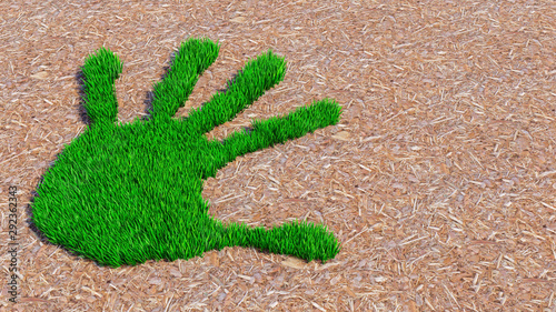 Concept or conceptual green grass handprint on wood shavings background. A metaphor for ecology, environment, recycle, nature conservation, spring or protection against global warming 3d illustration