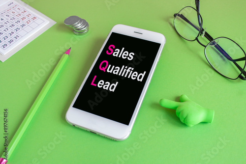 Concept red words Sales Qualified Lead on the mobile phone screen. Beautiful green background. Glasses, pen, coins. Business and SQL concept.