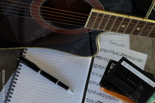 concept song composer: guitar, tape cassette, notebook, song notes and pen