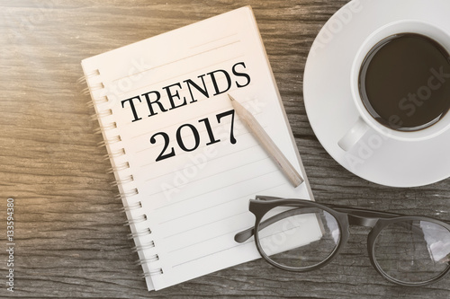 Concept Trends 2017 message on notebook with glasses, pencil and
