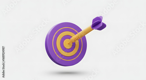 Conceptual 3D illustration of a dart hitting the center of a purple target, symbolizing successful goal achievement, business strategy, and precision