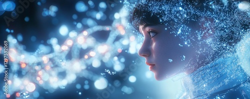 conceptual art piece of a futuristic DNA strand glowing in vibrant blues and whites, symbolizing scientific progress, Generative AI