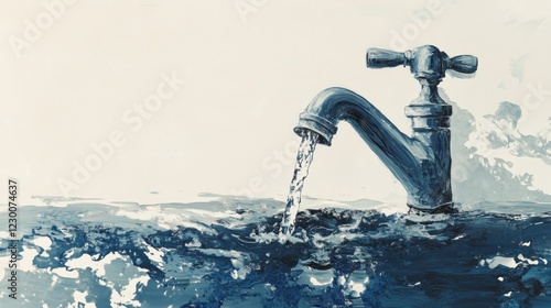 Conceptual art showing a water faucet with a few drops struggling to fall, symbolizing a global water crisis