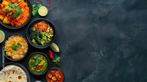 Conceptual banner showcasing a burst of colorful Indian dishes with copy space