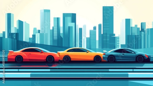 conceptual business illustration, three-car pileup on highway, contrasting bright car colors against subdued cityscape, flat vector design, symbolic representation of automotive industry risks,