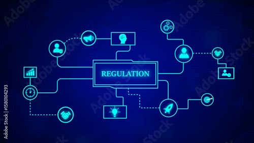 Conceptual diagram illustrating regulation and its components in a digital technology ecosystem with various related symbols and icons on a gradient blue background.