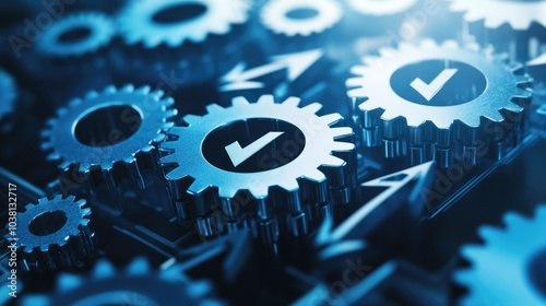 Conceptual gears and arrows in a blue-toned illustration, illustrating the mechanics of progress in business strategy.