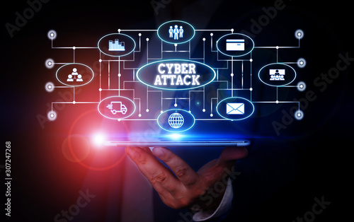 Conceptual hand writing showing Cyber Attack. Concept meaning attempt by hackers to damage or destroy a computer network Male wear formal suit presenting presentation smart device