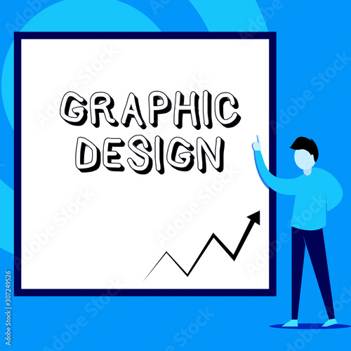 Conceptual hand writing showing Graphic Design. Concept meaning art or skill of combining text and pictures in advertisements Man standing pointing up blank rectangle Geometric background