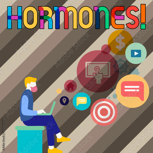 Conceptual hand writing showing Hormones. Concept meaning Regulatory substance produced in an organism to stimulate cells Man Sitting with Laptop and SEO Driver Icons on Blank Space
