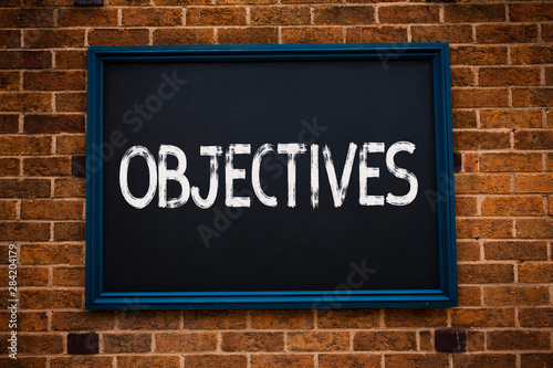 Conceptual hand writing showing Objectives. Business photo showcasing Goals planned to be achieved Desired targets Company missions Framed hang black board study class brick wall background