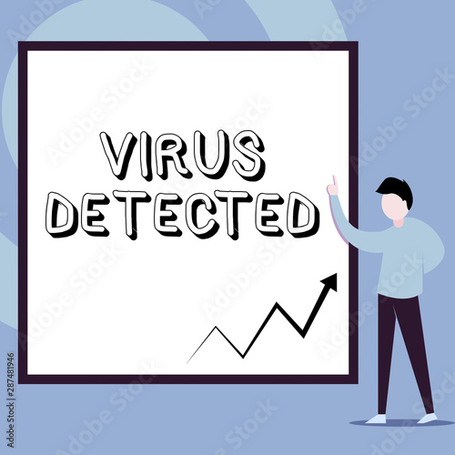 Conceptual hand writing showing Virus Detected. Concept meaning A computer program used to prevent and remove malware Man standing pointing up blank rectangle Geometric background
