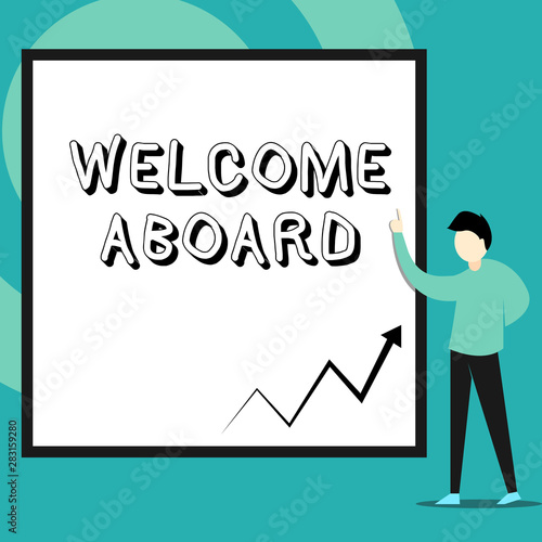 Conceptual hand writing showing Welcome Aboard. Concept meaning Expression of greetings to a demonstrating whose arrived is desired Man standing pointing up blank rectangle Geometric background