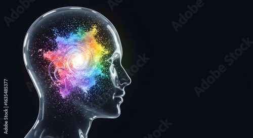 Conceptual Illustration of a Human Head Silhouette Filled with a Swirling Galaxy of Colorful Particles, Representing Creativity, Imagination, and the Power of the Mind.