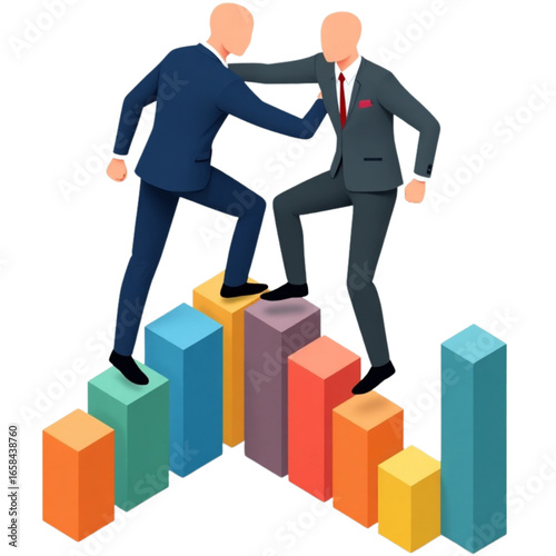 Conceptual illustration of teamwork and mutual support in business, showing two colleagues helping each other climb a rising bar graph