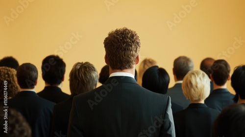 Conceptual image of a businessman in formal suit facing crowd symbolizing leadership, competence, and professionalism in a corporate environment.
