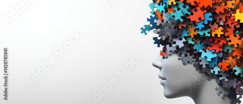 Conceptual image of a mannequin head with colorful puzzle pieces, representing mental health, creativity, and problem solving