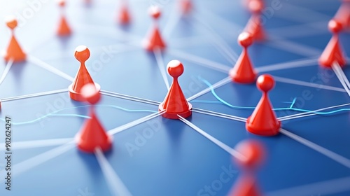 Conceptual image of connections and networking represented by red game pieces on a blue background, symbolizing interaction.