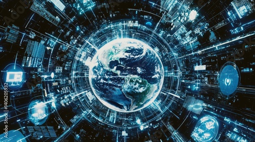 Conceptual image of Earth surrounded by renewable energy symbols for global green energy movement