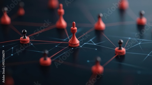 Conceptual image of red chess pawns on a digital network, representing strategy, connectivity, and digital communication.