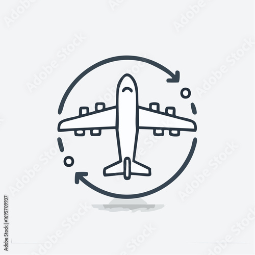 Conceptual line art icon of an airplane with circular arrows, symbolizing round-trip flights, global logistics, and air transportation services