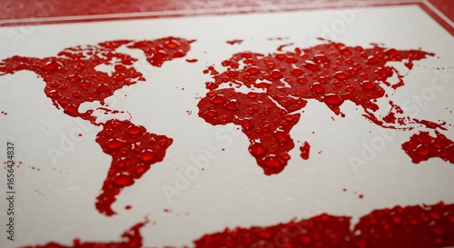 Conceptual world map with continents made of red textured droplets, a metaphor for a global pandemic, crisis, or worldwide issue.