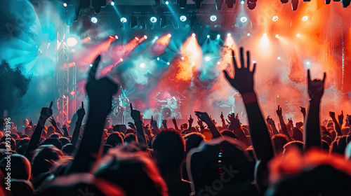 Concert Crowd Under Vibrant Stage Lights at Music Festival, Excited Audience, Live Performance, Energetic Atmosphere, Festival Lights, High-Resolution Image, Music Event, Dynamic Stage Lighting
