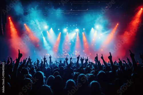 concert scene with a cheering crowd, illuminated by colorful stage lights in shades of blue and red.