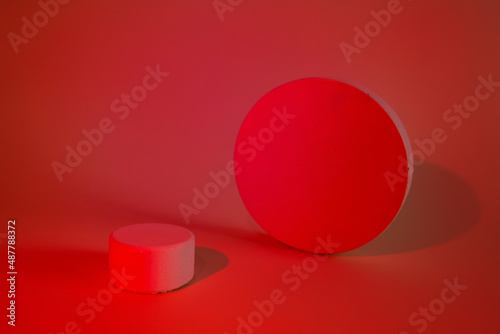 Concrete circle shaped pedestal on green light neon background. Podium mockup background for products. Advertising template. Stone platform. Abstract geometric