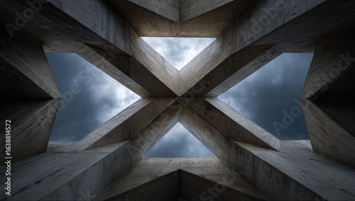 Concrete crossbeams, angled upwards, framing a cloudy sky