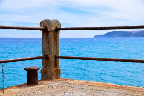 Concrete post of rusty ship bollard at the end of a concrete pier overlooking the Atlantic Ocean