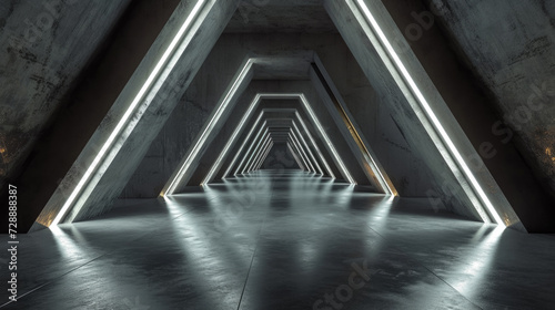 Concrete tunnel background, minimalist design of dark grey garage with lines of led light. Perspective view of modern underground warehouse. Concept of hall, room, interior, building